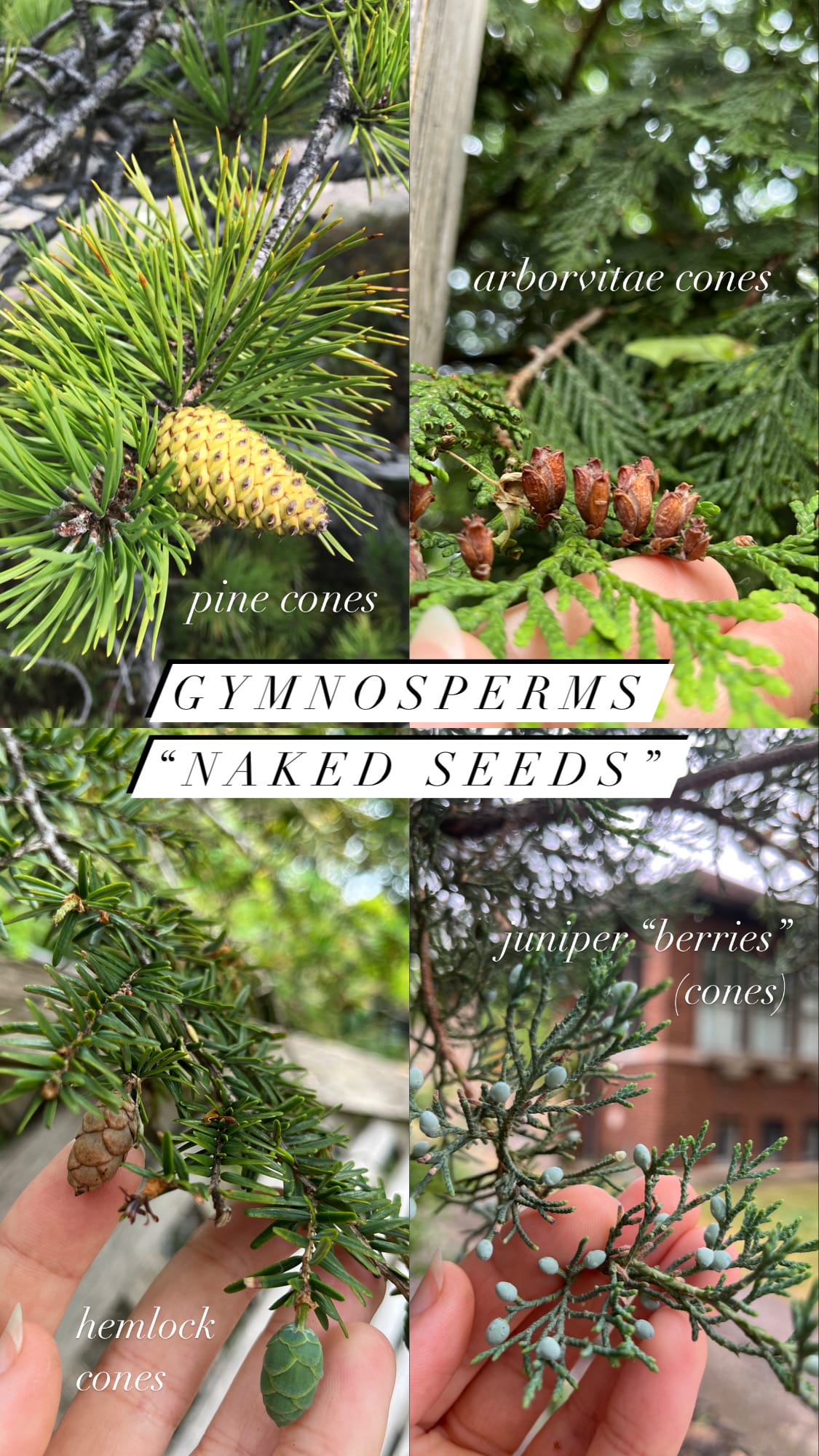 ππππππππππ means βnaked seedβ. gymnosperm are non flowering trees. their seeds include seed cones like pine cones, arborvitae cones, hemlock cones, arborvitae cones, juniper βberriesβ which if you look close are actually little cones, and yews which have βberry-likeβ cups. all needle-leaved and scale-leaved conifers that make up πππππππ ππ divisionβincluding yews, pines, spruces, cypresses, and junipers (thatβs right, not all evergreens are pines π²π²)βtogether with ginkgos (which are in their own division of πππππππππ ππ, more on them later) make up gymnosperms.