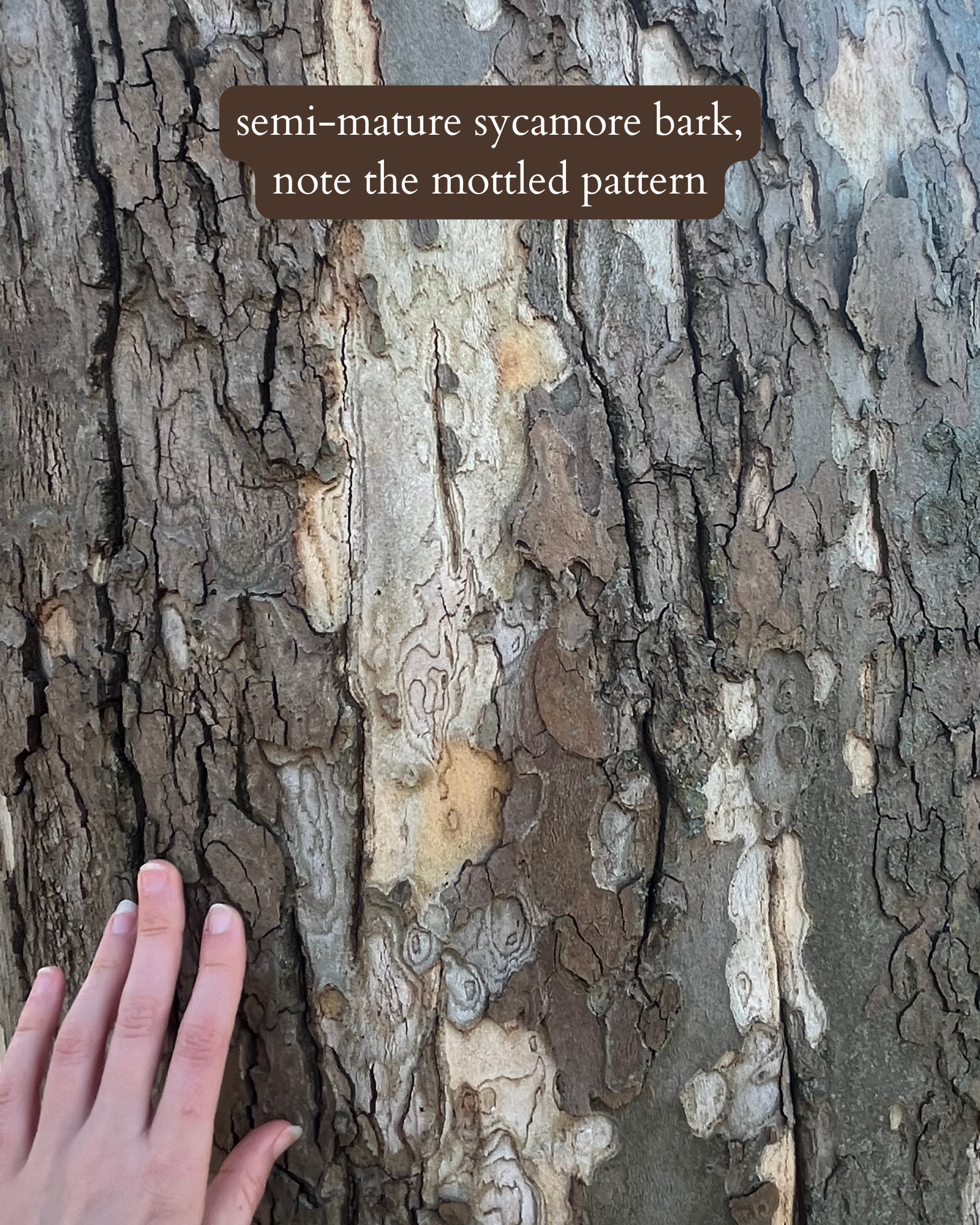 ππππππππ bark is unique. young trunks have smooth, pale, mottled (spotted or blotched with patches of brown, green, gray, and white) bark that people say resembles a camouflage pattern. the bark of older, mature sycamores develops rough grey scales at the base, but if you look up the tree, the branches still show their classic sycamore mottled pattern.