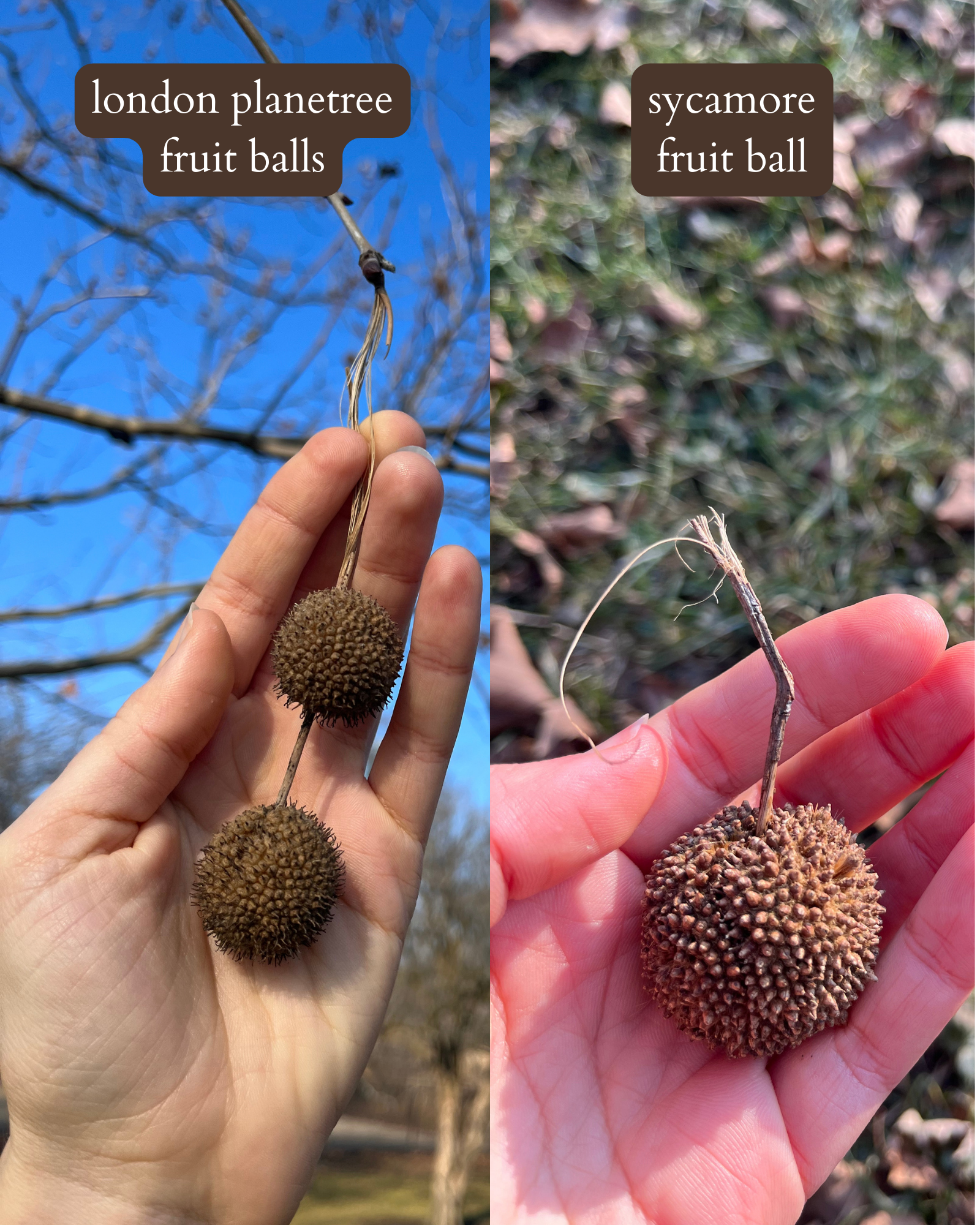 two london planetree seed (fruit) balls in fall and summer (left & right) and an american sycamore fruit (seed) ball (middle)