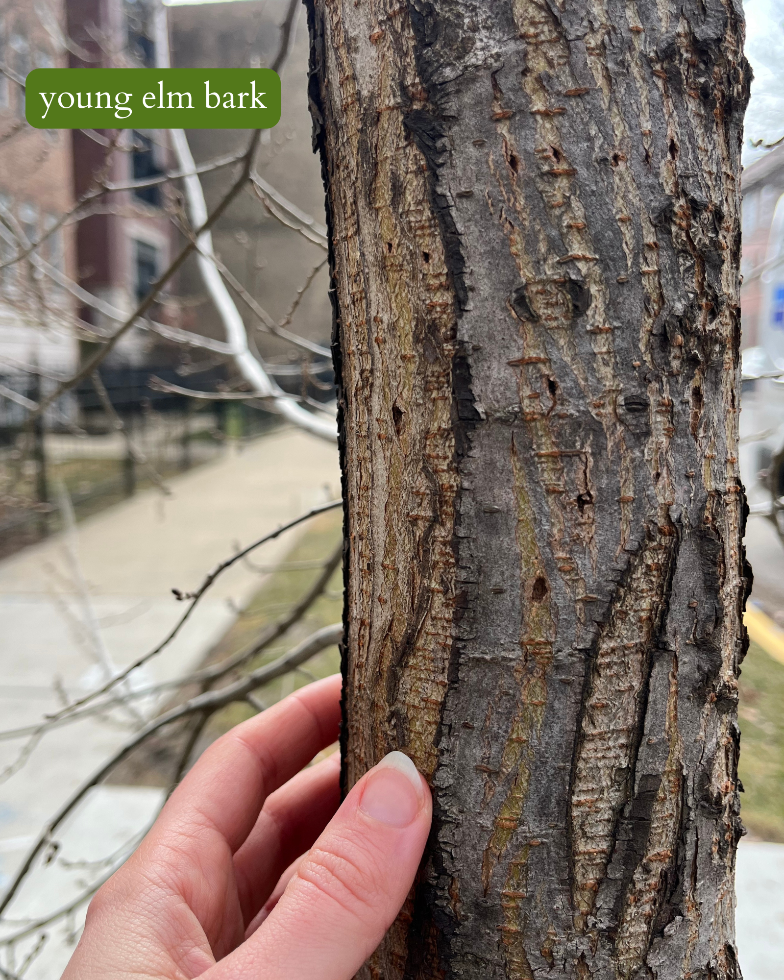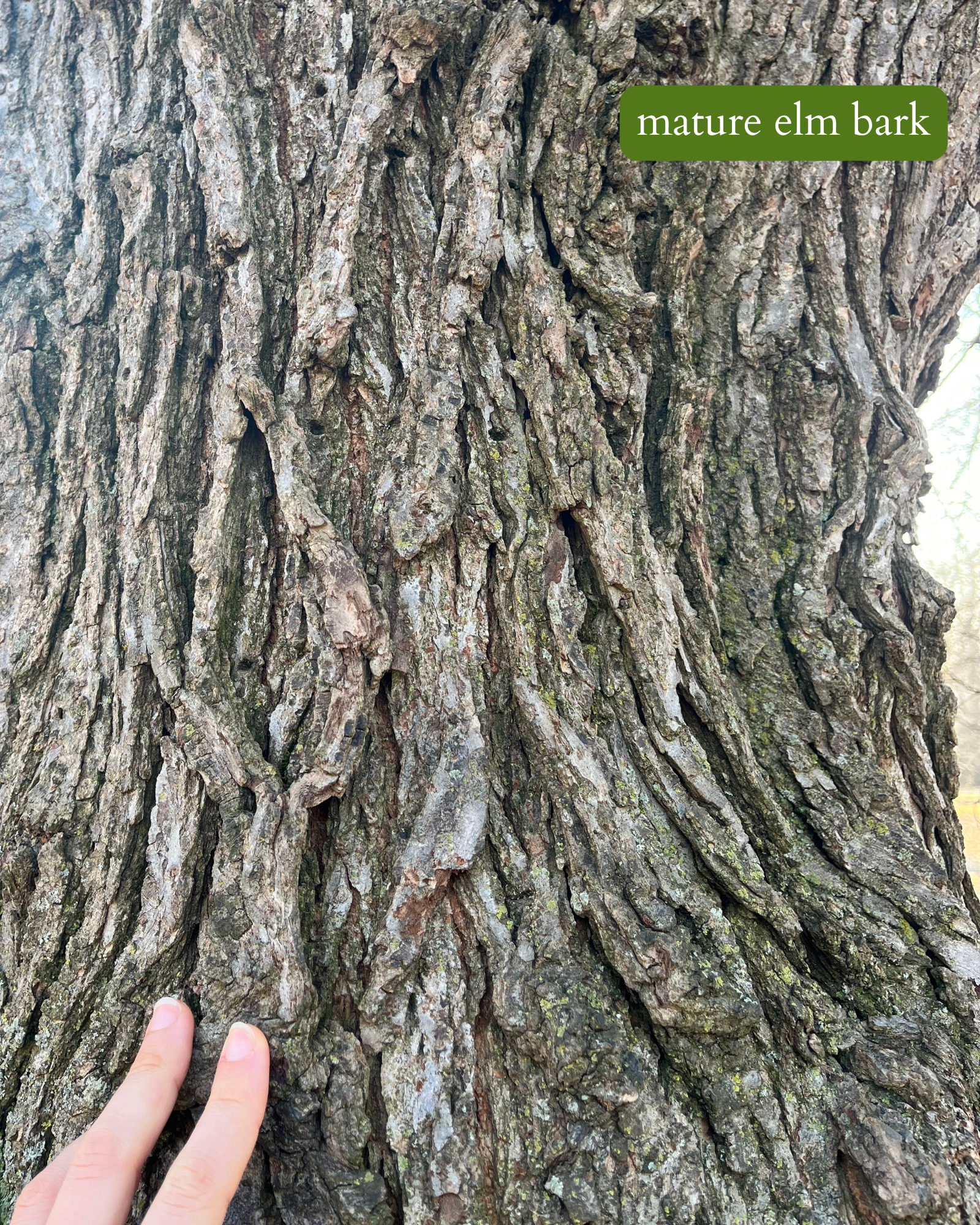 πππ bark can be a bit harder to identify. there are six native elm species on turtle island with five others commonly cultivated. young elm bark is slightly furrowed with scaly ridges, while mature elm bark is more deeply furrowed into narrow, irregular, interlacing ridges.